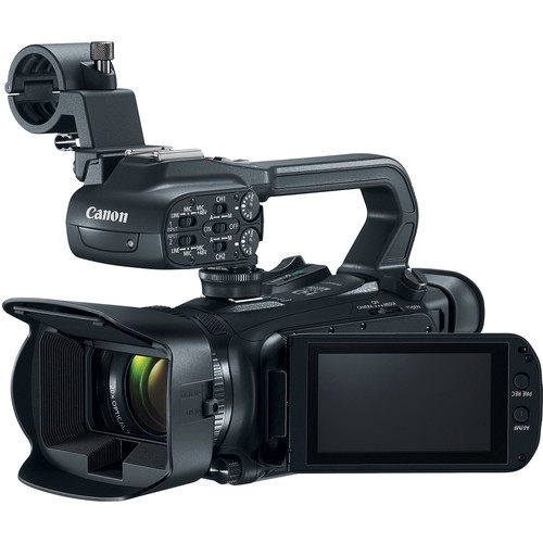 The XA11 features both a 3.5" OLED touch panel view screen with a 10,000:1 contrast ratio, and a color electronic viewfinder with 1,560,000 dots of resolution. The camera features full manual control and auto modes for exposure, focus, white balance, gain, and shutter speed. The camera provides professional features such as a pre-record buffer, peaking, zebra bars, color bars, and reference tone. The zoom speed is adjustable with variable, constant (with 16 different speed levels), fast, normal, and slow settings. The camera features a detachable top handle with zoom toggle, record start/stop, IR emitter, tally light, accessory shoe, external mic holder, two XLR connectors with phantom power, and manual audio level controls. The XA11 includes a built-in headphone jack and Mini HDMI connector, and it outputs composite video and audio via a 3.5mm mini-jack.
