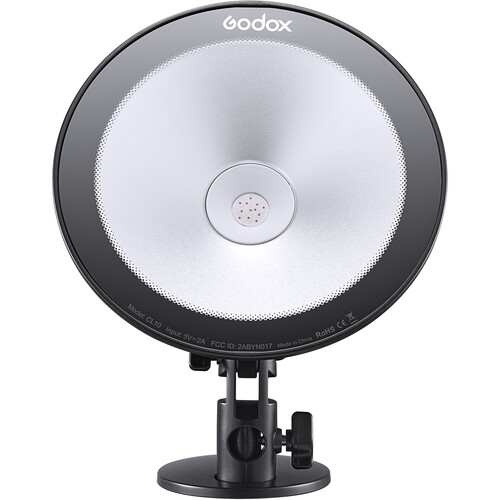 Cleverly designed for webcasting, the CL10 LED Webcasting Ambient Light from Godox boasts portability, power options, and outstanding color control. The 7.6" diameter light is an RGB light source with Hue, Saturation, and Intensity control, giving shooters access to 36,000 custom colors to personalize their livestreaming sessions. The CL10 also has 39 built-in effects including RGB Cycle, Flash, Laser, Broken Bulb, TV, Candle, Fire, Fireworks, Police Car, Fire Truck, Ambulance, Music, and SOS. While you can make these selections locally on the fixture you can also make them wirelessly with the included IR remote or with your smartphone via a free app. Another CL10 bonus is portability. Since it's USB-powered it can be charged from your laptop, computer, or from an AC socket via the included adapter.