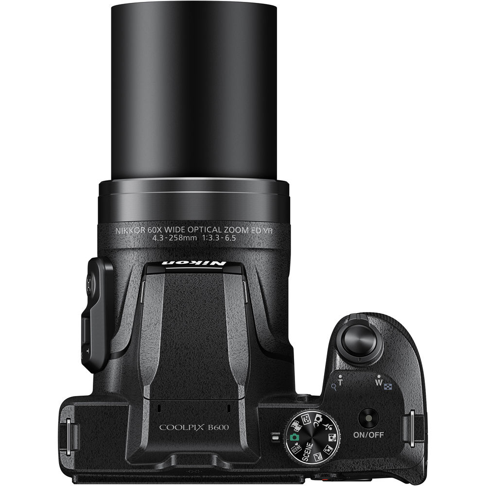 With a long zoom and apt imaging, the black Nikon COOLPIX B600 is a flexible point-and-shoot suitable for photographing in a wide variety of conditions. A 16MP CMOS sensor and EXPEED image processing yield high-resolution, well-defined imagery with a broad ISO 125-6400 sensitivity range and a quick 7-fps shooting rate for photographing moving subjects. Full HD video recording is also supported, at 30p and 60i, and 4-axis Hybrid VR helps to steady video footage for smoother recording. Complementing the imaging assets is the impressive 60x Zoom-NIKKOR ED lens, which covers a 24-1440mm equivalent focal length range to suit shooting in nearly any situation. Lens-shift VR benefits stills shooting at long focal lengths and with slower shutter speeds, and compensates for the effects of camera shake for up to three stops. Rounding out the B600's feature-set, the camera has a rear 3.0" 921k-dot LCD monitor, built-in Wi-Fi and Bluetooth for wireless sharing and control, and a slew of Scene and Creative modes to further enhance the look of your imagery.