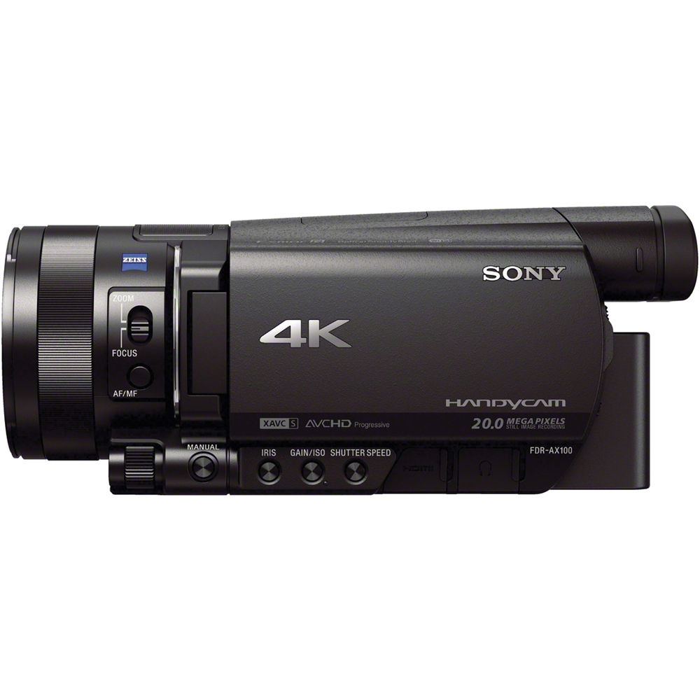 The FDR-AX100 is a versatile camcorder that lets you capture UHD 4K 3840 x 2160 video at 24 and 30 fps. You can also record Full HD 1920 x 1080 video in XAVC S, AVCHD, or web-optimized MP4, as well as take high-quality 20MP still images. Media is recorded to SD or Memory Stick Duo memory cards. For X-AVC S recording, SDXC Class 10 cards are required.