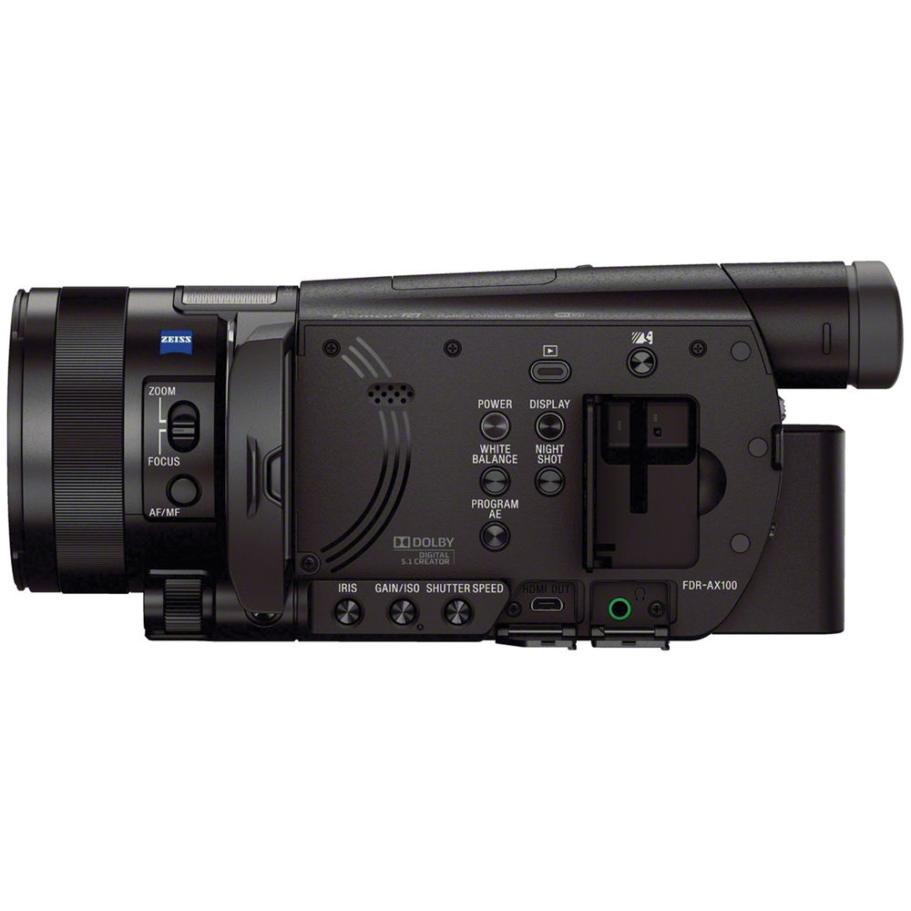 The black Sony FDR-AX100 Full HD Camcorder brings Ultra HD 4K video to the palm of your hand, delivering resolution four times that of Full HD. The 1" Exmor R CMOS sensor is approximately 8x larger than that of typical camcorders, allowing you to capture cinematic images with shallow depth of field for defocused backgrounds. The camcorder features a wide-angle Zeiss Vario-Sonnar T* lens with 12x optical zoom plus 24x Clear Image digital zoom. Optical SteadyShot image stabilization with Active Mode delivers smooth video, and 3-Way-Shake-Canceling adds electronic roll stability for even smoother results.