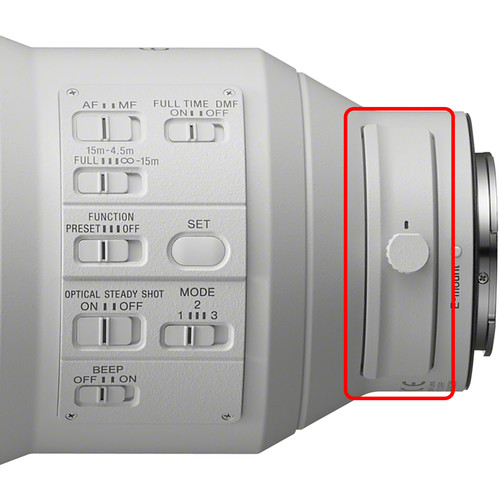 The FE 600mm f/4 GM OSS includes a function ring with a switch that lets you select Preset (preset focus), Function, and Off positions. When in the Preset position, the Set button is initially used to memorize the desired focus point, and moving the function ring in either direction will immediately set focus to the memorized point. This can be an advantage for sports and other rapidly changing situations, allowing focus to be preset in advance and instantly recalled to ensure that the decisive moment is properly captured. This function is available whether shooting with AF or MF and can focus outside a set focus limit range. When in the Function position, functions can be assigned to the Function mode via a camera body menu. If Power Focus is assigned and the function ring is rotated, focus shifts smoothly at a speed determined by the amount of function ring rotation. This allows smooth focus shift for movies. If APS-C/Full Frame Select is assigned, the function ring can be rotated to switch between APS-C and full-frame angles of view.